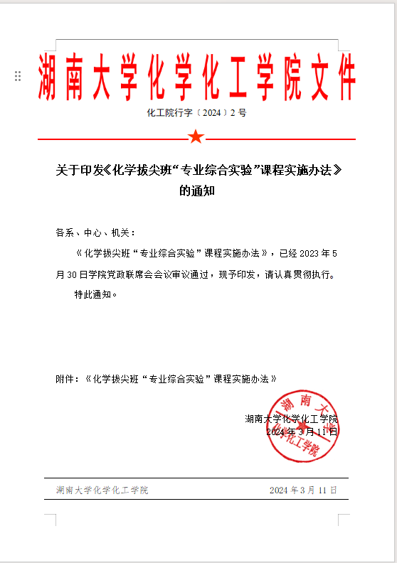 关于印发《化学拔尖班“专业综合实验”课程实施办法》的通知