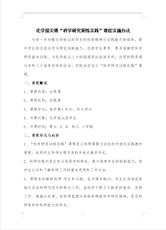 关于印发《化学拔尖班“科学研究训练实践”课程实施办法》的通知