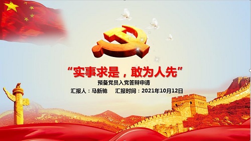 马新驰同志汇报了一年来的思想情况,说明了对党的认识和入党动机,汇报了在一年的预备考察期间思想、工作、学习方面起到的模范带头作用和自身存在的不足及改进方向。王元同志提问,马新驰同志进行了预备党员转正答辩。