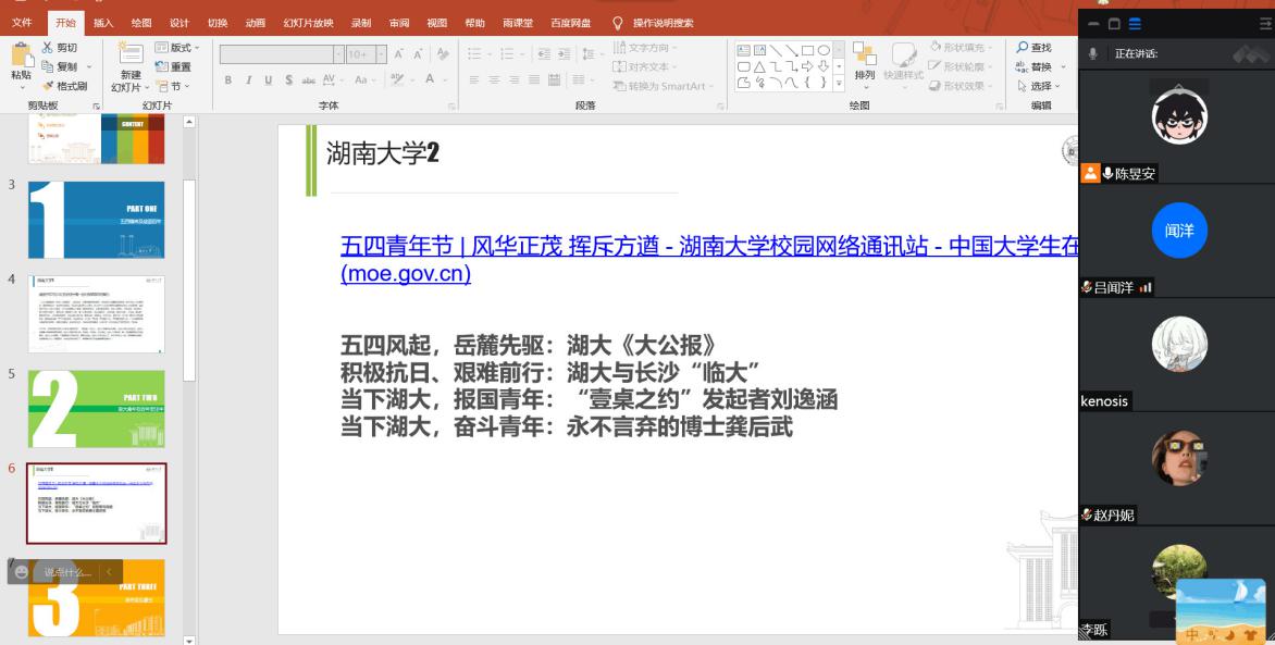 随后,陈昱安同学就同学们身边的具体例子来谈五四精神,《大公报(长沙)》冲破军阀封锁,报道爱国运动,勇做岳麓先驱;“壹桌之约”跨越疫情,成人漫画