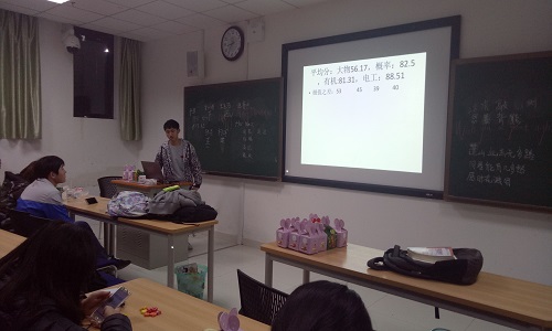 班会伊始,班长符祖祺同学向同学们展示了期中考试各科各分数段的人数和平均成绩,然后采用比较的方法为同学们做出了分析。总体来看,有机和概率的期中成绩比较乐观,特别是有机的平均成绩达到了81.5,但是大学物理的成绩不太理想,最高分和最低分相差53分。通过比较得出了结论:前半学期部分同学在学习上很用心,但还存在部分同学放低了对自己的要求,在学习上松懈了,所以导致了两级分化。为此,班长鼓励同学们说:“虽然我们班还存在许多的问题,但希望同学们能够抓紧现在的每分每秒,亡羊补牢,为时不晚,争取赢得一个没有遗憾的期末。”