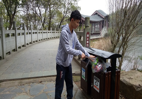三点钟,同学们准时在东方红广场集合,班长和生活委员带来了提前准备好的手套、垃圾袋和钳子,并将这些工具分发给同学们,三点半便向着岳麓山进发。由于岳麓山上的游客很多,同学们的公益行动有些困难,但同学们依旧热情满满。班长符祖祺以身作则,用钳子夹走那些草丛中的纸屑和果皮,同学们也四处搜寻,不放过任何一个角落。沿途的一次次弯腰和上坡使得同学们早已满头大汗,但他们并没有觉得不耐烦。梁婷同学跟周围的同学说道:“虽然爬山加上捡垃圾挺累的,但是看到自己走过的地方变得干净,手中的垃圾袋变得越来越满,还是挺有满足感的。”