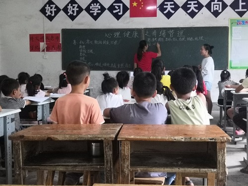 “明月几时有,把酒问青天……”今天的国学经典诵读以一首歌开始。张雅楠与刘文娟两位老师先带领大家朗诵了苏轼的《水调歌头》,为了让孩子们记得更加深刻,在孩子们已经读会了后便开始教他们唱。孩子们似乎对这种学习方法颇感兴趣,掌握很快。当地学生很多是留守儿童,“但愿人长久,千里共婵娟”是他们心中最美好的愿望。