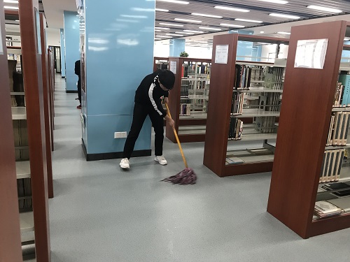 德智图书馆进行志愿清扫图书馆活动。班内同学分为两组人马,分别来到图书馆三层和四层进行相关清洁工作。工作具体分为擦拭书架及清理地面,女生主要负责书架而男生则负责擦地。