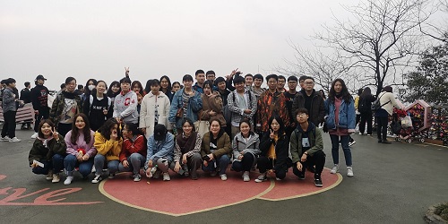 活动的最后一个部分是山顶颁奖和合影。在所有的小组都成功登顶后,两个班级的活动负责人们对各个小组完成任务的情况进行了统计,并对完成任务数量最多的几个小组颁发了奖品。最后,伴着岳麓山靓丽的春景,两个班级在山顶进行了合影,本次联谊活动圆满结束。