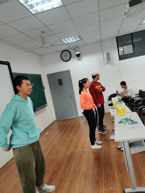 活动开始前,同学们有说有笑的赶到了307教室营造了一种轻松的氛围。活动9正式开始首先进行人员分组,同学们每人抽取一张扑克牌并按扑克牌上的图案形状及颜色找到自己的队友,最终分成了三组。活动开展的第一个游戏是的你比划我来猜游戏猜对最多的一组获胜。比划的同学用自己丰富的肢体语言表达了比划的内容,如波橘云诡、只手遮天、井底之蛙等四字成语和天蓬元帅等名著人物。其中,波橘云诡一词难倒了同学们,直到最后揭晓答案大家才恍然大悟。负责猜的同学也非常给力,大多默契地猜对了。经过几轮激烈的角逐,第二组取得了游戏的胜利。