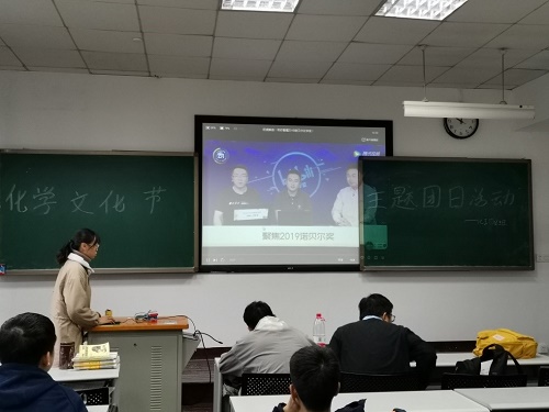 接下来,便进入活动的主要环节—展现名人风采,同学们一起观看了关于2019年诺贝尔化学奖的获得者古迪纳夫的视频,古迪纳夫老爷爷一生的主要研究领域是电池和能源,80年代他就证明了锂离子电池的氧化钴可以产生4伏电压,而现年97岁高龄的他仍保持每天7点左右开始工作,一周只休息半天的工作强度,他把一生都奉献在了自己所热爱的科研事业上,同学们在台下聚精会神地看着视频,议论纷纷,不由得发出惊叹的声音,无不表示出他们对这位诺贝尔奖获得者的敬佩之情,心里也都种下了一颗关于科研的种子。看完视频之后,同学们心中的震惊和感慨可想而知,视频内容拓宽了同学们对于化学学科的认识,增强了学科自信,并鼓励同学们为科研献出自己的一份力量。同学们受益匪浅