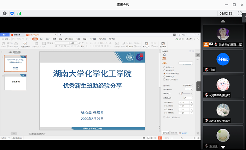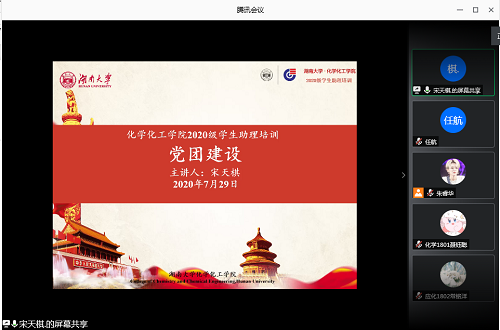 于腾讯会议举行化工院第四场线上学生助理培训以及2019级学生助理的经验分享会。本次培训由化工院本科2020级辅导员宋天棋老师对党团建设进行讲解说明,徐心昱,张煜希同学进行经验分享。