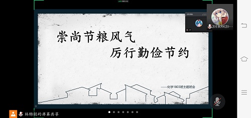 化学1803班班长林锦聪通过腾讯会议开展了“崇尚节粮风气,厉行勤俭节约”的线上主题班会。意在积极响应习近平总书记坚决制止餐饮浪费行为,切实培养节约习惯的号召,呼吁同学共同营造“浪费可耻、节约为荣”的氛围。