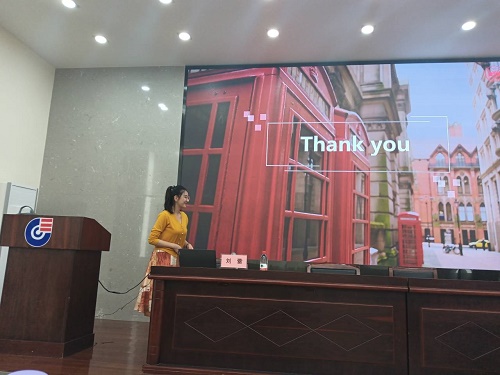 海外交流项目组成员刘蕾老师。刘蕾老师先笑着问:“同学们是希望我站着讲还是坐着讲?”在同学们异口同声地回答“坐着”后,刘蕾老师坐下,开始进入正题。