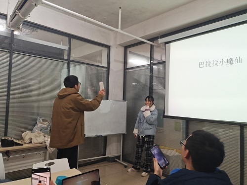 在第一轮欢声笑语的下,紧接着进行第二轮游戏“你划我猜”项目。游戏规则即主持人随机抽取学号并两两搭配。玩家一在事先整理好的图片库里随机抽取一张照片后,根据图片信息向玩家二比划,若玩家二在两分半钟说出正确词语,即取得胜利。本轮游戏旨在引导同学们之间相互互动,增加同学之间的信任和合作并寻找到同学们之间的共同兴趣爱好。