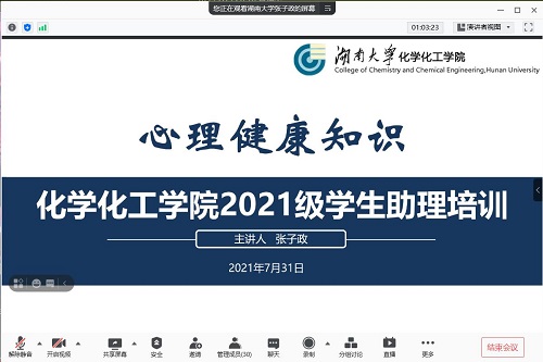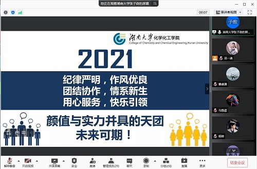 通过腾讯会议举行化工院第四场线上学生助理培训以及2020级学生助理的经验分享会。本次培训由化工院本科2021级辅导员张子政老师主讲,2020级学生助理蒋源洁同学进行经验分享。
