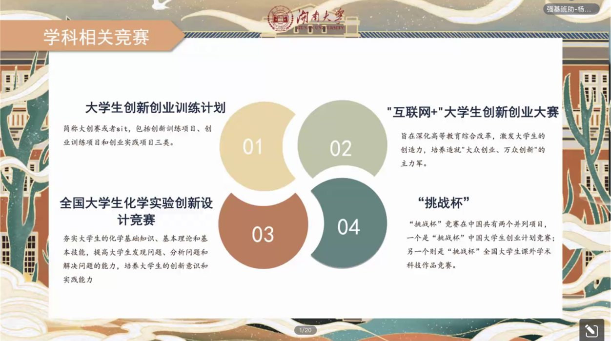 同时展示了强基班部分课程安排以及特色课程,介绍了学科相关竞赛,鼓励同学们重视课程的学习并积极参加各类学科竞赛,提升自己的专业能力。