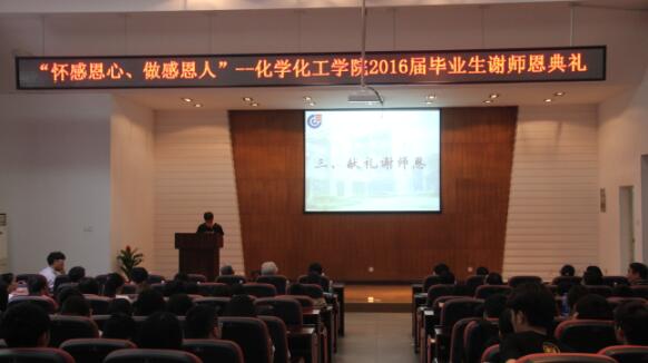 院长蒋健晖教授,院党委书记王玉枝教授,副院长王双印教授、聂舟教授,院党委副书记陈义红老师,以及2012级各班班导师,化学系、化工系,应化系部分专业老师等。谭蔚泓院士因在外出差无法亲临现场,但也以短信形式向所有毕业生表达了毕业祝福。谢师礼由2012级本科生吴天忍主持。