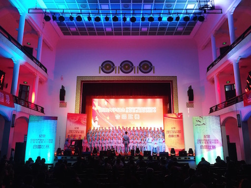 合唱的时候要时刻凝视指挥的手,在什么时候结束延长音,在什么时候唱出下一个音调,都由指挥发号施令。全员站定,指挥李晗升同学和钢琴伴奏杨昕同学向观众席鞠躬。第一首演唱曲目是《四渡赤水出奇兵》。“横断山,路难行”,女朗诵孙洋同学声音铿锵有力,宛如一枚炮弹在此处炸开;男朗诵陈智鹏同学毫不示弱,“敌人弃甲丢烟枪,我军乘胜赶路程”,他的朗诵掷地有声、荡气回肠,让人不禁联想到红军乘胜追击的壮烈场面。朗诵结束后,李晗升同学挥动左手下达开始伴奏的指令,杨昕同学的指尖轻扫琴键,动人的旋律便流泻出来。两名女领唱韩璐和彭柳郁同学,两名男领唱宋增旭和刘子烋同学出场,他们浑厚有力的歌声回荡在整个大礼堂。合唱队高低声部合作默契,二重音自然流畅,一场气势恢弘的盛宴在这个舞台展开。每个人都全身心投入,希望把自己最嘹亮的歌声献给在场的观众,献给克服种种艰难险阻披荆斩棘的红军们。