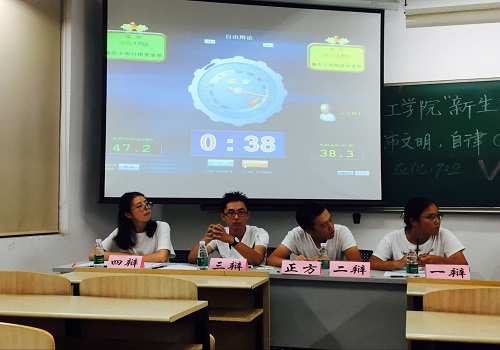本次辩论的流程分为六项:一辩手首先开篇立论。定义城市文明是公民整体素养和道德风尚状况,阐述正方观点:自律应是人人必备的一种基本素质,是城市文明的真正推动力,相比之下自律比他律更重要。紧接着是反方二辩盘问正方一辩,反方拿圣人孔子七十岁才做到“从心所欲,不逾矩”来进行盘问,出其不意攻其不备使正方一辩措手不及,不禁让全场同学紧捏一把汗,反方又步步紧逼,使赛场上的气氛迅速升温。接着反方一辩不失风度地确立“他律具有强制性和普遍性,并且更加有效,相比之下诚实文明中他律更重要”的论点对正方反驳。