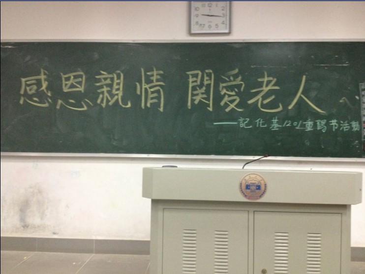 2013年10月13日,正值重阳佳节。为了响应学校关于丰富学生课余文化生活的号召,同时也为了弘扬孝顺父母老人,感恩亲情温暖的中国梦,保护濒临消失的传统文化,化工院12级化学基地班举行了以“感恩亲情 关爱老人”的主题班会,切身回报父母,关怀体贴老人。