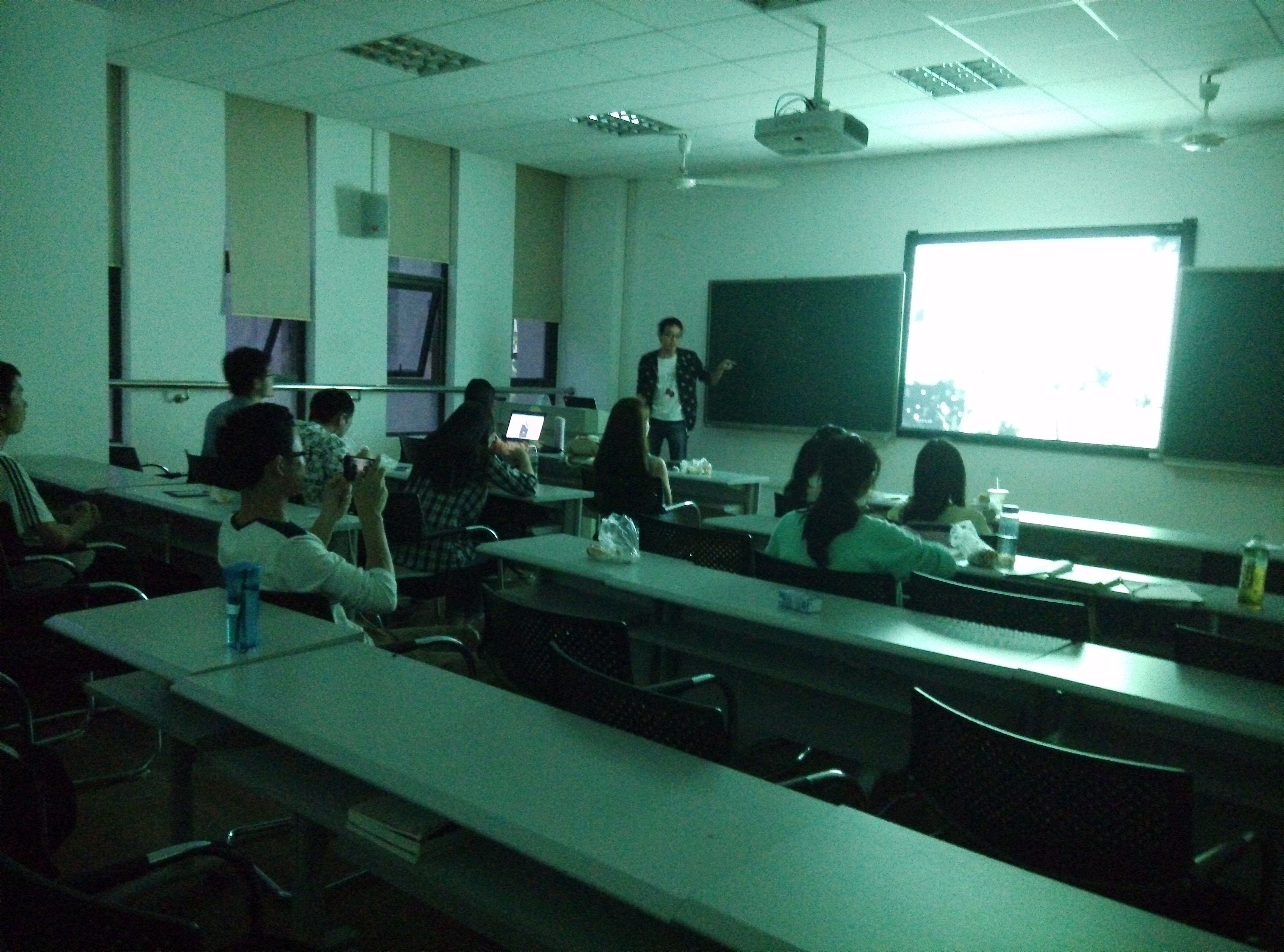 班会内容由杨旗所在寝室确定,主讲人杨旗。班会主要采取ppt放映外加讲解的形式进行,希望能让全体同学都参与其中。杨旗先用一段清新的歌曲带领大家回忆初恋,歌曲放送时伴随着纸人儿间的爱恋故事,很好的渲染了初恋时期的氛围。同学们在歌曲的带领下思绪翱翔,神情认真。
