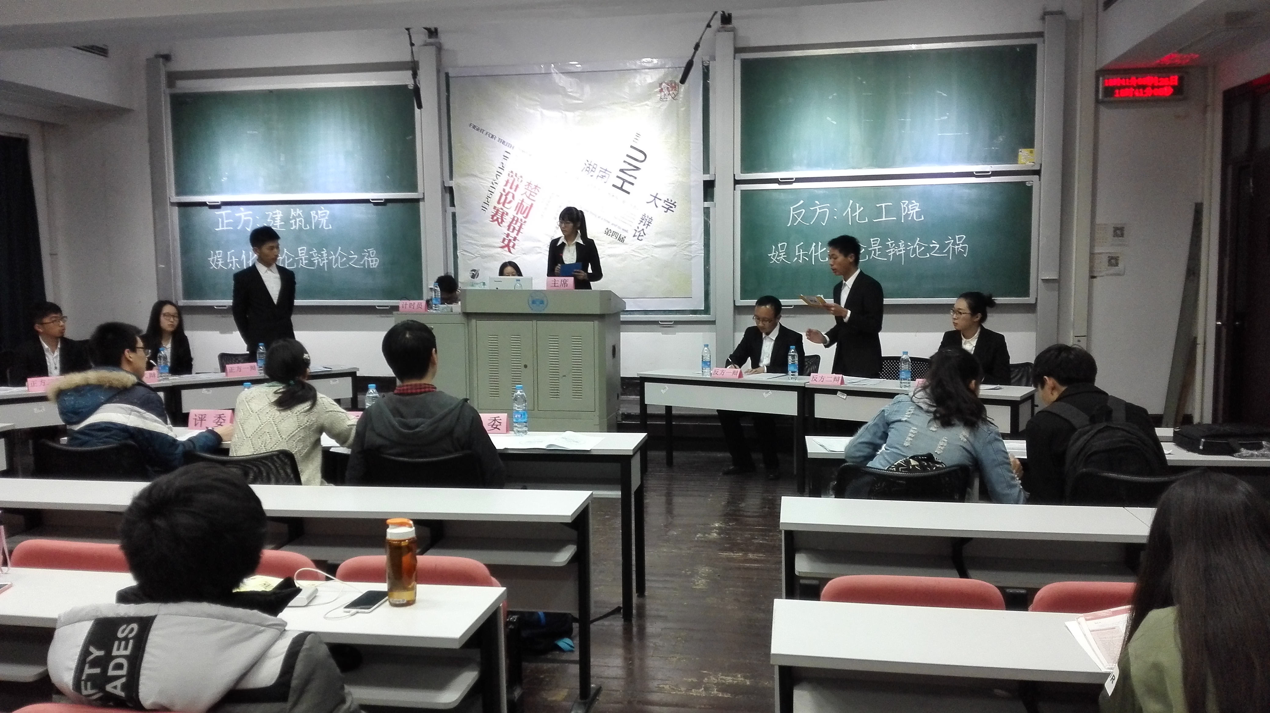 2016年3月26日晚上六点半,第四届麓山会讲•楚材群英辩论赛在中楼举行。中楼106举行的辩论赛是由正方建筑学院对阵反方成人漫画