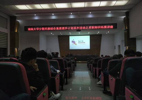 就业指导处处长樊媛吉老师、新疆内派老师曹瑞江老师及湖南省教育厅民族教育处副处长田惠老师为少数民族同学们进行了讲解。全校十几个院系共几百名少数民族同学参加了此次讲座。