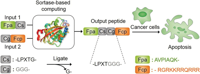 生物计算作为一个信息处理工具在多参数传感和生物医学方面显示巨大的潜力。长期以来,生物分子逻辑门获得了科学界的广泛关注,然而在以往的研究中,大多数的工作都还局限于DNA分子逻辑门,而多肽逻辑门却因其氨基酸残基多样且复杂的化学性质而鲜有报导。因此,亟需开发一种通用型多肽生物逻辑系统,执行更复杂而精准的逻辑调控。日前,我校成人漫画 、化学生物传感与计量学国家重点实验室聂舟教授研究团队报道了一种新颖的复杂多肽逻辑系统,将转肽酶Sortase A作为通用生物处理器,成功实现了细胞行为的调控。