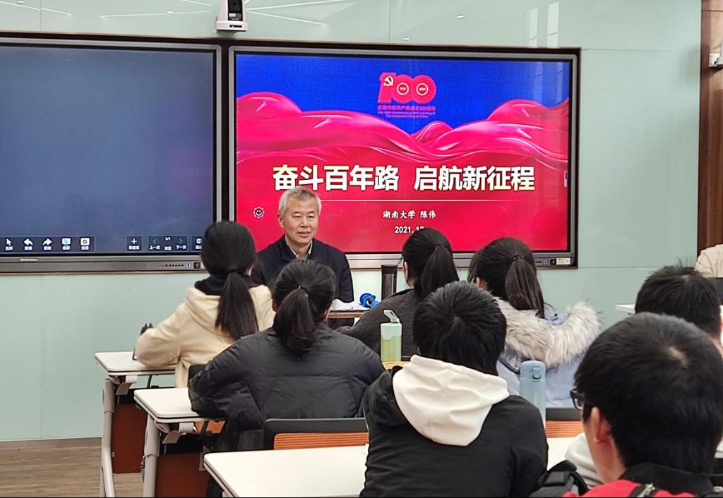 课程开始,陈伟老师以“两弹一星”功勋科学家钱学森苟利国家、不求富贵、一心为国的故事为引,结合理科试验班特色,向同学们提出了做“人民科学家”的殷切希望,随后便开始了正式内容的讲授。首先,陈伟老师以数字盘点的方式对党的十九届六中全会精神进行了详细解读,对国内与国际社会的不同观点进行了对比分析,并结合党的历史上三次重要决议内容,指出中国共产党的一百年是团结带领中国人民艰苦奋斗、取得辉煌成就的一百年,党的十九届六中全会精神是回首百年党史、对过往工作经验的科学总结,更是开启下一个百年新征程的行动指南,面临当今世界百年未有之大变局,党领导下的中国即将面临新的挑战,这需要同学们勇担时代重任,以自身所学为国家发展作出更大贡献。随后,陈伟老师分三个层次为同学们详细解读了习近平总书记“七一”重要讲话精神,一是从中国共产党在革命、建设与发展的各个历史时期以及中国特色社会主义迈入新时代所取得的伟大成就,总结了中国共产党百年来的丰功伟绩;二是通过李大钊、焦裕禄、张桂梅等优秀共产党员以及蔡和森、邓中夏等党史上的湖大人的先进事迹,向同学们阐释了中国共产党坚持真理、坚守理想,践行初心、担当使命,不怕牺牲、英勇斗争,对党忠诚、不负人民的伟大建党精神;三是对习近平总书记在“七一”重要讲话中鲜明昭示的“九个必须”分别进行说明,引导同学们从中国共产党的百年奋斗中看清楚过去我们为什么能够成功、弄明白未来我们怎样才能继续成功,以史为鉴,开创未来。
