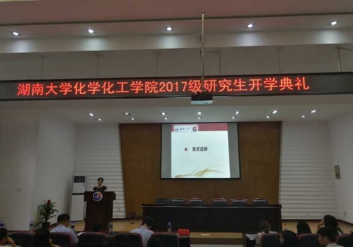 于新化工楼D区报告厅举行了17届研究生入学典礼。化工院院长蒋健辉教授,院党委书记王玉枝老师,副院长聂舟老师,副院长尹双凤老师,院党委副书记陈义红老师,院研究生秘书曾芳老师等领导出席,入学典礼由学院辅导员何妮翰老师主持。