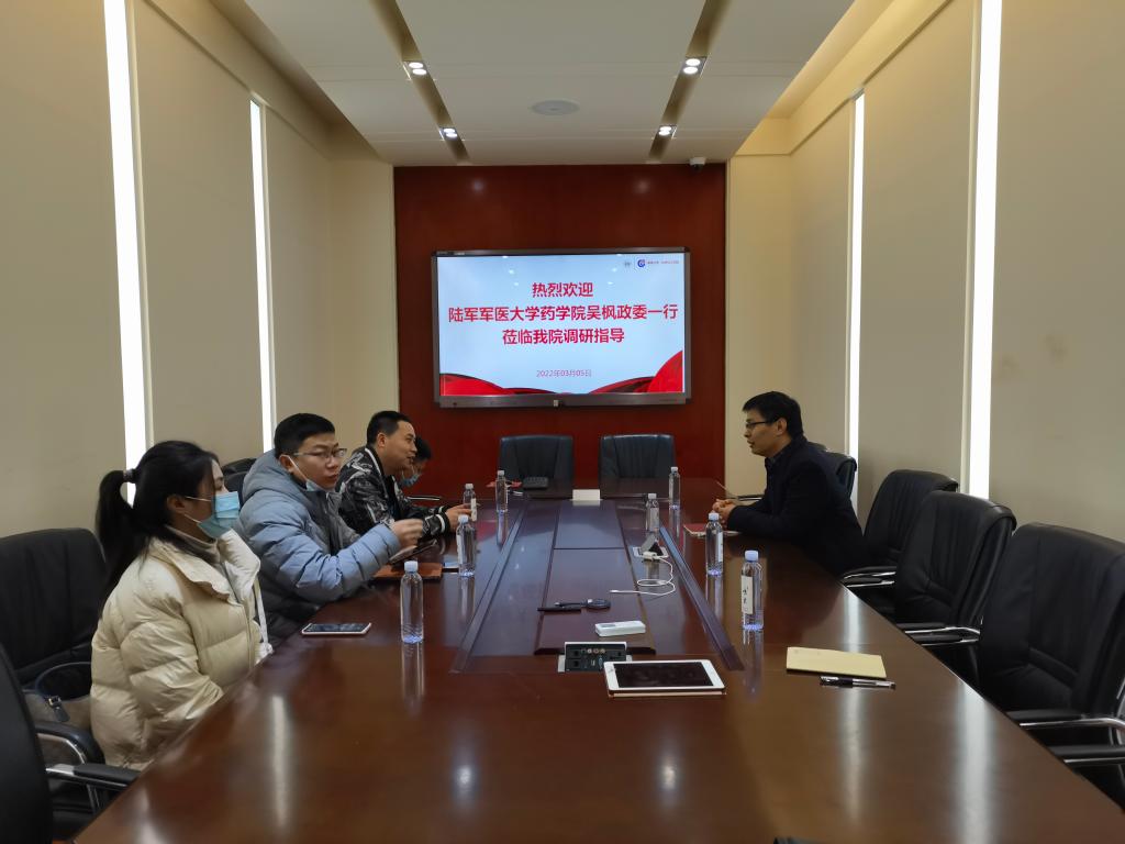 3月5日上午,陆军军医大学药学院吴枫政委一行4人来学院考察交流,学院党委书记王双印、副院长赵万祥和化学生物学系主任王雪强参加交流。 王双印首先代表学院对吴政委一行的到来表示欢迎,并介绍了学院的基本情况。双方就人才培养、学科建设、队伍建设和科学研究等方面开展深入交流探讨,并表示今后将加强各方面的交流,建立长期友好合作关系。