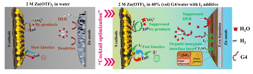 “鸡尾酒优化”电解液助溶剂-催化剂协同效应提升锌硫电池性能示意图。