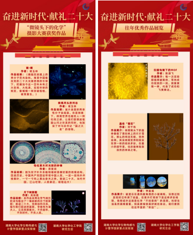 2022年10月14日至24日,在校园各地举办“奋进新时代,献礼二十大”线下巡回展览活动:深化党史宣传,弘扬党史文化,并展出系列“微镜头下的化学”摄影活动中的优秀作品,一同庆祝党的二十大胜利召开,激发广大师生树立不忘科学报国初心、牢记科技强国使命的理想信念,在新时代新征程中勇立潮头、引领创新,传承红色精神。
