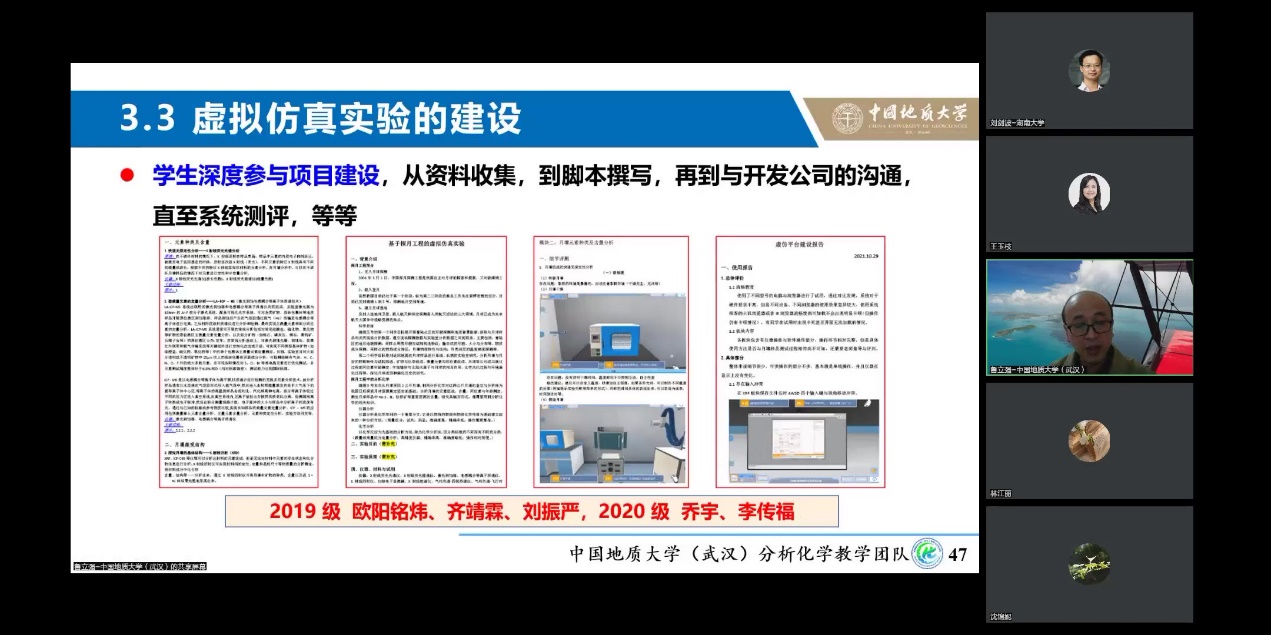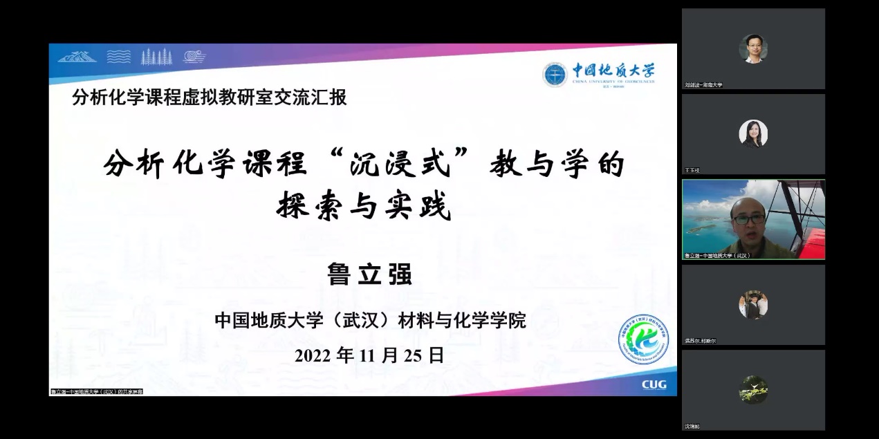鲁老师首先深入解读了以学生为主体,从学生的体验和兴趣为出发点的“沉浸式”教学的关注点,随后从学情分析、自我介绍、点名、绪论课教学、时事案例引入、师生参与的案例库建设等方面介绍了如何上好第一堂课。在理论课教学中,探索以资料收集、互动游戏、微视频制作、图表绘制、翻转课堂、对分课堂、案例分析等多种方式来增强学生的参与感和体验感。在实验课教学中,不仅强调动手,更强调动脑,在实验教学中融入课程思政,在实验细节中引导学生“寻根问底”,让学生深度参与建设“基于探月工程的月壤组成和性质分析虚拟仿真实验”,结合科研指导本科生开展创新性实验,指导学生自选项目,结合水质分析等实际问题开展综合性实验。之后,鲁老师分享了开展“沉浸式”教学的个人感悟并进行互动讨论。讲座最后,国家教学名师王玉枝教授做了总结发言,充分肯定了中国地质大学(武汉)分析化学教学团队在“沉浸式”教与学上做出的有效探索与实践,以及在分析化学课程虚拟教研室建设中做出的贡献。