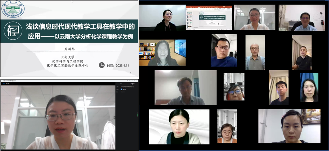 4月14日,分析化学课程虚拟教研室举行了第十三期讲座,由宦双燕教授主持,云南大学的周川华副教授为主讲嘉宾,她报告的题目是:浅谈信息时代现代教学工具在教学中的应用——以云南大学分析化学课程教学为例,四十多位教师参与了线上会议交流,还有三十多位教师观看了教研直播。