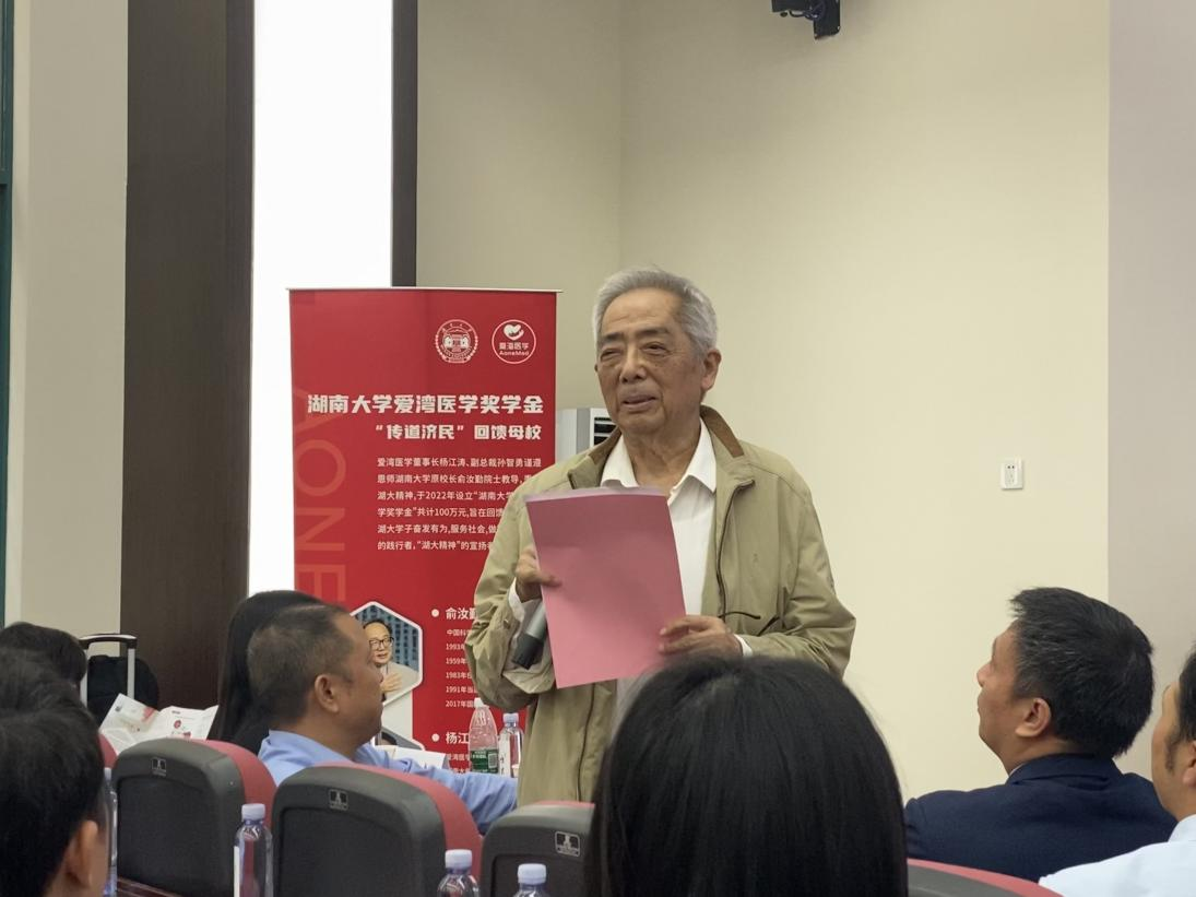张晓兵院长致欢迎辞。他向专程回到学院参加颁奖仪式的杨江涛院友及爱湾医学科技集团高管表示热烈的欢迎和衷心的感谢,同时向荣获爱湾医学奖学金的同学们表示热烈的祝贺。他表示,爱湾医学奖学金的设立,是学校杰出校友积极回馈母校、反哺母校的生动体现,在激励湖大学子勤奋学习、报效祖国等方面起到了积极的示范作用。期待未来在院友杨江涛董事长的关心支持下,进一步推动校企资源互补互促,开创校企合作新局面,结出校企合作新硕果。