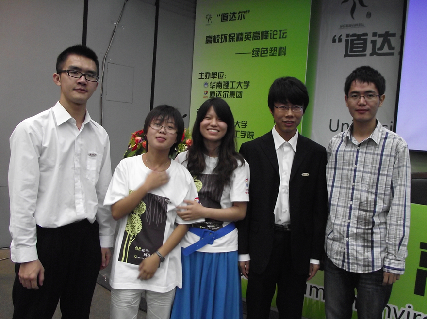 2008级本科生齐云强、朱丽娜、毛冀川、陈家驹、褚蕊、李东洋,2010级本科生汤蓉和我校土木工程学院2008级佘羽8名本科生组成,他们设计的作品“集成绿色环保经济节能大规模回收再利用废弃塑料处理系统社会模型”在论坛中得到了评委和嘉宾们的好评,尤其是独特的“绿点”创意吸引了法国评委们的关注。他们以废旧塑料为材料制作的工艺品《仕女图》、《争春》两幅版画得到了现场观众们的赞许,他们的优异表现给现场的评委嘉宾和各高校的参赛选手们留下了深刻的印象。最终“湘塑”代表队凭借着优异的综合表现在全国16所高校的19支代表队中脱颖而出,以第三名的成绩成为获得金奖的八支队伍之一,为我校争得了荣誉。浙江大学、山东大学等高校的11支代表队获得银奖。