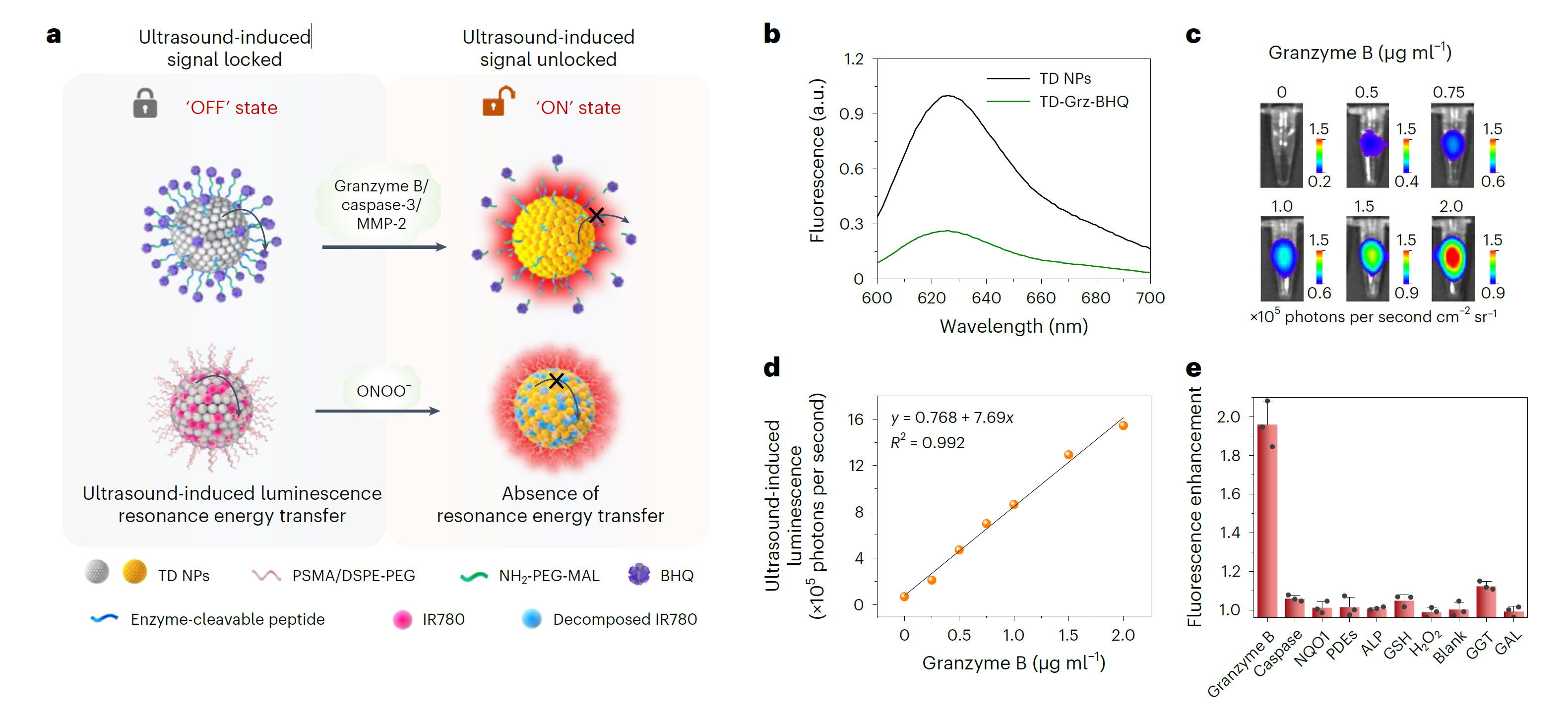 研究团队还提出了一种酶活化的超声发光探针设计,通过不同酶可切割的肽序列作为连接剂,实现了对酶动态活动的成像。这种技术为定制各种酶响应型超声诱导发光探针提供了一个多功能平台,为生物医学研究和临床诊断带来了新的可能性。
