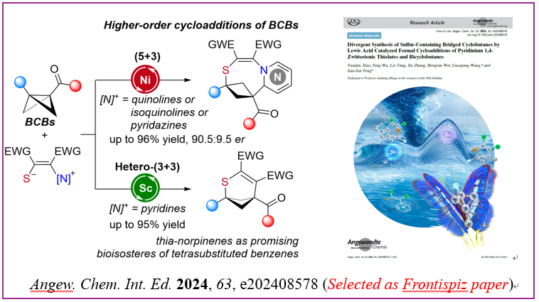 冯见君教授课题组最近以双环丁烷(BCB)的环加成反应为突破口,发展了一系列双环丁烷的原子经济性(3+X)反应,丰富了双环[n.1.1]烷烃的化学空间;开创了手性钯催化策略和双齿螯合型BCB的手性路易斯酸催化策略为光学纯的双环[n.1.1]烷烃的高效、高选择性合成铺平道路。上述研究成果分别在《J. Am. Chem. Soc.》,《Angew. Chem. Int. Ed.》,《Nature Communications》等高水平期刊上发表。代表性成果简介如下: