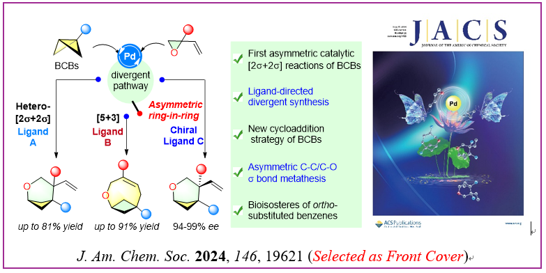 为了进一步拓展光学纯双环[n.1.1]烷烃的化学空间,冯见君教授课题组通过逆向思维利用手性钯催化剂活化双环丁烷(3+X)环加成反应中的“X”环加成组分进而引入手性环境,成功地发展了首例钯催化双环丁烷的不对称环加成反应。此外,通过配体调控该课题组还实现了双环丁烷与烯基环氧的(3+3)和(5+3)环加成反应的可控切换,多样性合成一系列双环[n.1.1]烷烃。这一成果以封面文章的形式发表在《J. Am. Chem. Soc.》上,冯见君教授和复旦大学张俊良教授为共同通讯作者,成人漫画