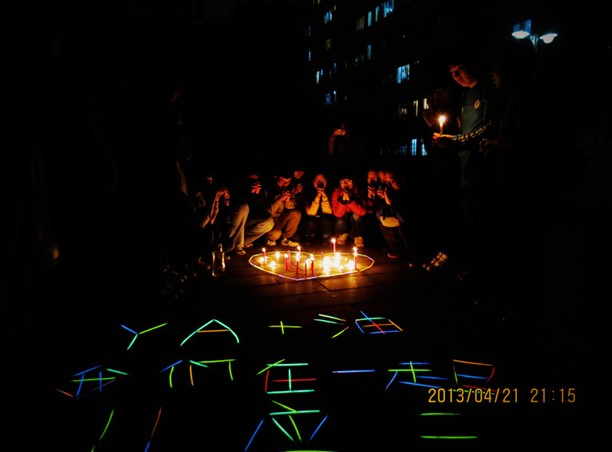 2011级应用化学二班的学生在天马篮球场举行的祈福仪式。班长刘仲民介绍:“得知雅安发生7级地震之后,大家都的心情都沉重,我们没有办法去现场,72小时内是黄金救援期,我们希望灾区的同胞们挺住,我们为他们祈福。”