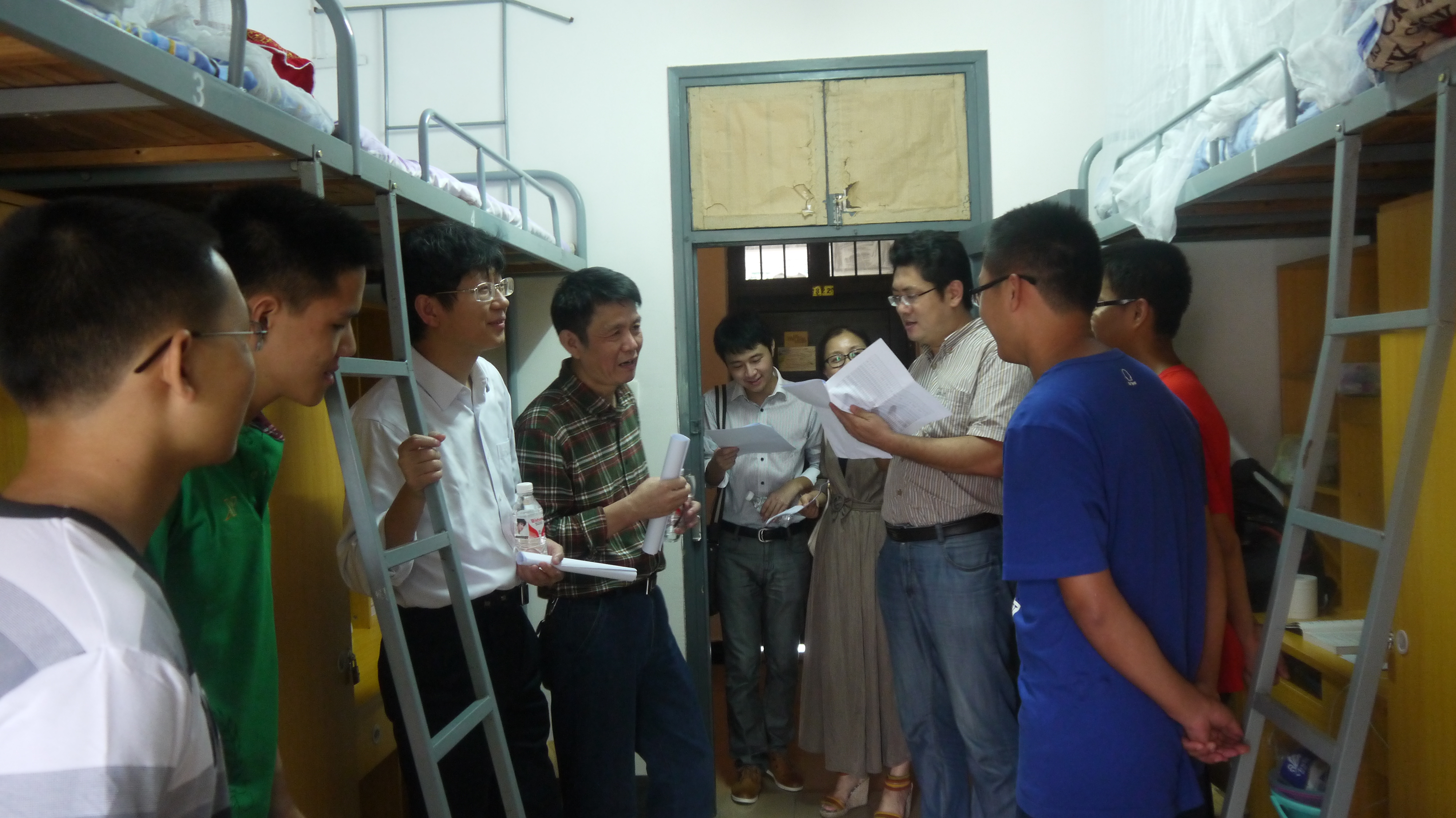 各位领导来到寝室看望新生。学院院长蒋健晖教授,学院党委书记王玉枝教授,学院副院长旷亚非教授、崔坤在教授,学院党委副书记陈义红老师等领导一行分成两组分别对男生和女生寝室进行走访慰问。此次陪同领导看望新生的还有学工办主任曾芳老师,分团委书记李辰老师,12级辅导员陈晓晖老师以及各班新生班主任。