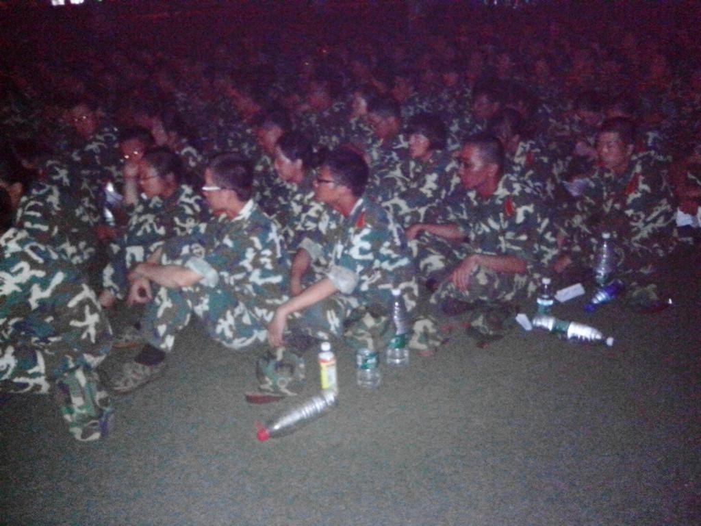 “八一红军旗,开天辟地第一回。人民有了子弟兵,从无到有靠谁人……”操场上回荡着新生们嘹亮的歌声。尽管晚上操场上没有灯光,看不清歌词,新生们用各自的方法克服困难。有的抓紧时间早早把歌词背完,有的打着手电筒。尽管训练一天很累,新生们仍然是保持着标准的坐姿,用最好的精神风貌、认真的态度不厌其烦地反复练习着用战士们的鲜血谱起的乐章。