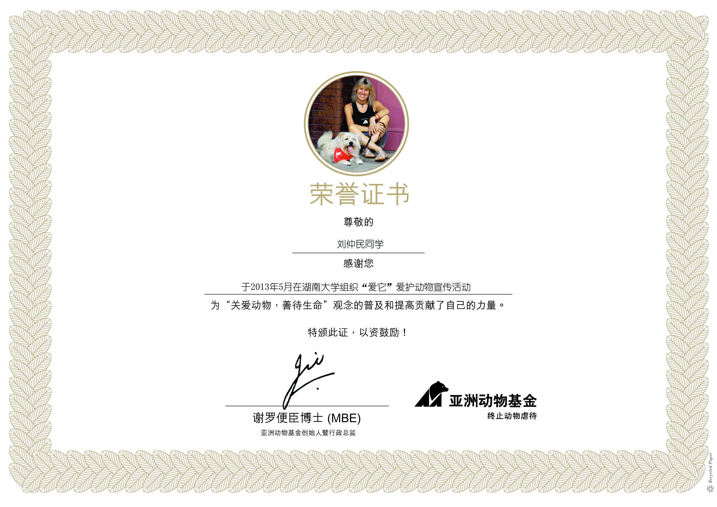 2011级应化二班发起的获得亚洲动物基金会“季度最佳活动奖”。