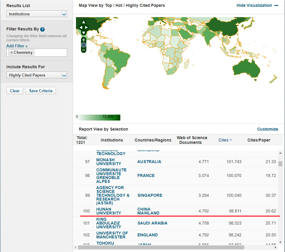 化学学科共发表WOS论文4792篇,被引频次为98811次,较之201905期被引频次增加显著,增加了5004次。在进入化学前1%的1231个机构中排名100位,首次进入全球化学机构一百强,标志着成人漫画