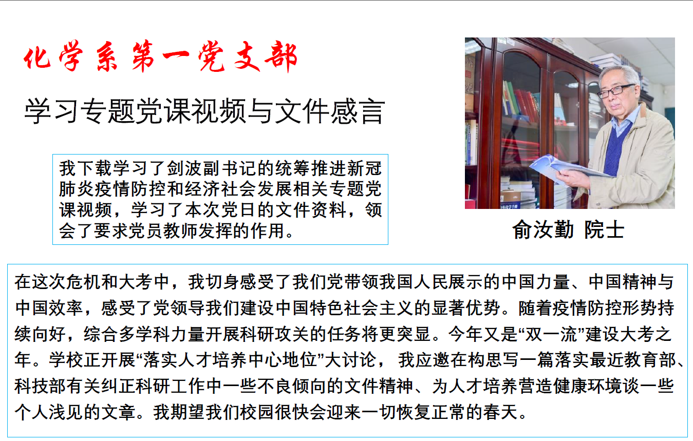 中国科学院院士俞汝勤表示:在这次危机和大考中,我切身感受了我们党带领我国人民展示的中国力量、中国精神与中国效率,感受了党领导我们建设中国特色社会主义的显著优势。随着疫情防控形势持续向好,综合多学科力量开展科研攻关的任务将更突显。今年又是“双一流”建设大考之年,学校正开展落实人才培养中心地位大讨论,我应邀写了一篇文章,为营造人才培养健康环境发表了一些个人浅见。