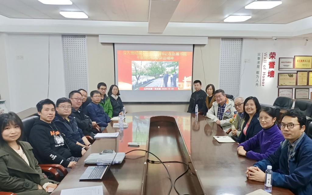 重要讲话精神”,化学系第一党支部于10月20日下午4:30在新化工楼D区204会议室召开学习研讨会,支部全体党员参加,张晓兵院长、王玉枝书记、俞汝勤院士出席。